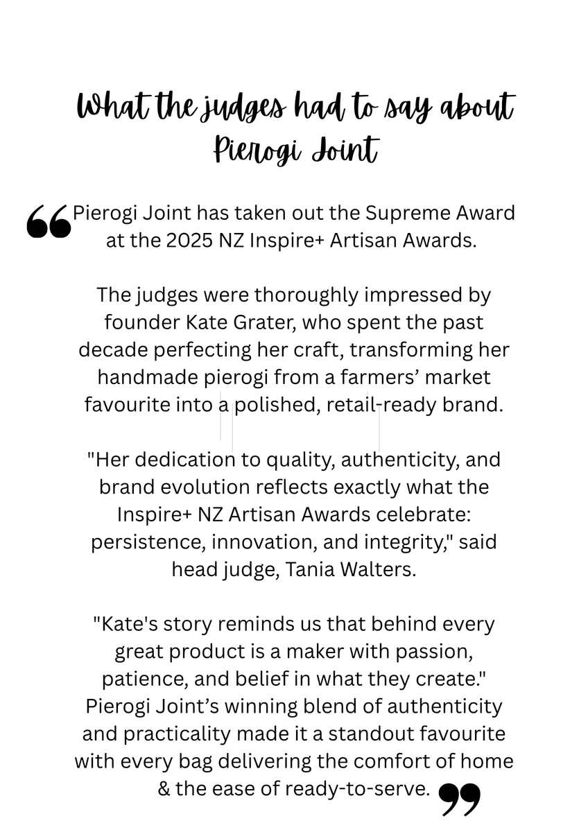Pierogi Joint is beyond grateful, humbled and proud to share this with fellow @nzartisanawards winners. Our journey from markets to retail is nothing short of miraculous as a niche, unheard of dumpling here in NZ. We are so proud to have shared @pierogijoint with our supportive customers and foodie community. Thank you to Taina and the judges for choosing pierogi. For seeing our hustle, handwork and innovation. Been recognized as a Supreme Winner 2025 and having $50k to use with Review Publishing, @supermarketnews NZ is an absolute dream. Heres to our mission statement continuation; pierogi is a household staple NZ wide. With Gratitude, Kate Grater, Founder